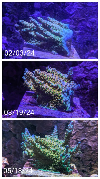 For some reason the first one got compressed like crazy by the website, it doesn't seem to like portrait orientation photos. The last one is just the last photo by itself in a normal horizonal shot and uploaded with a larger size too.Super super nice coral! Color and growth pattern texture are amazing.