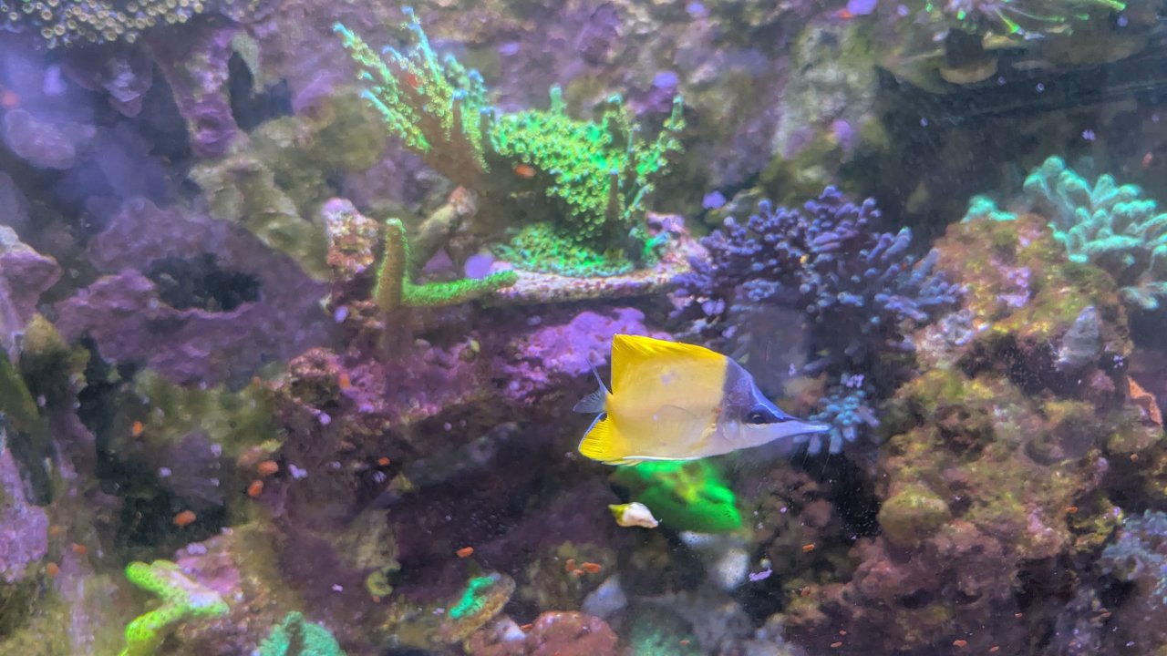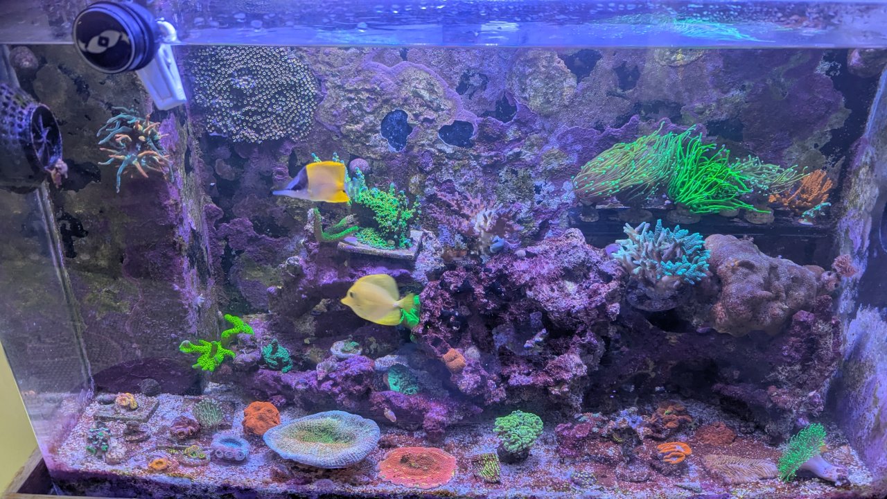 Next to the also tiny Zebrasoma flavescens who is scared of everything (probably hasn't ever seen corals or invertebrates):