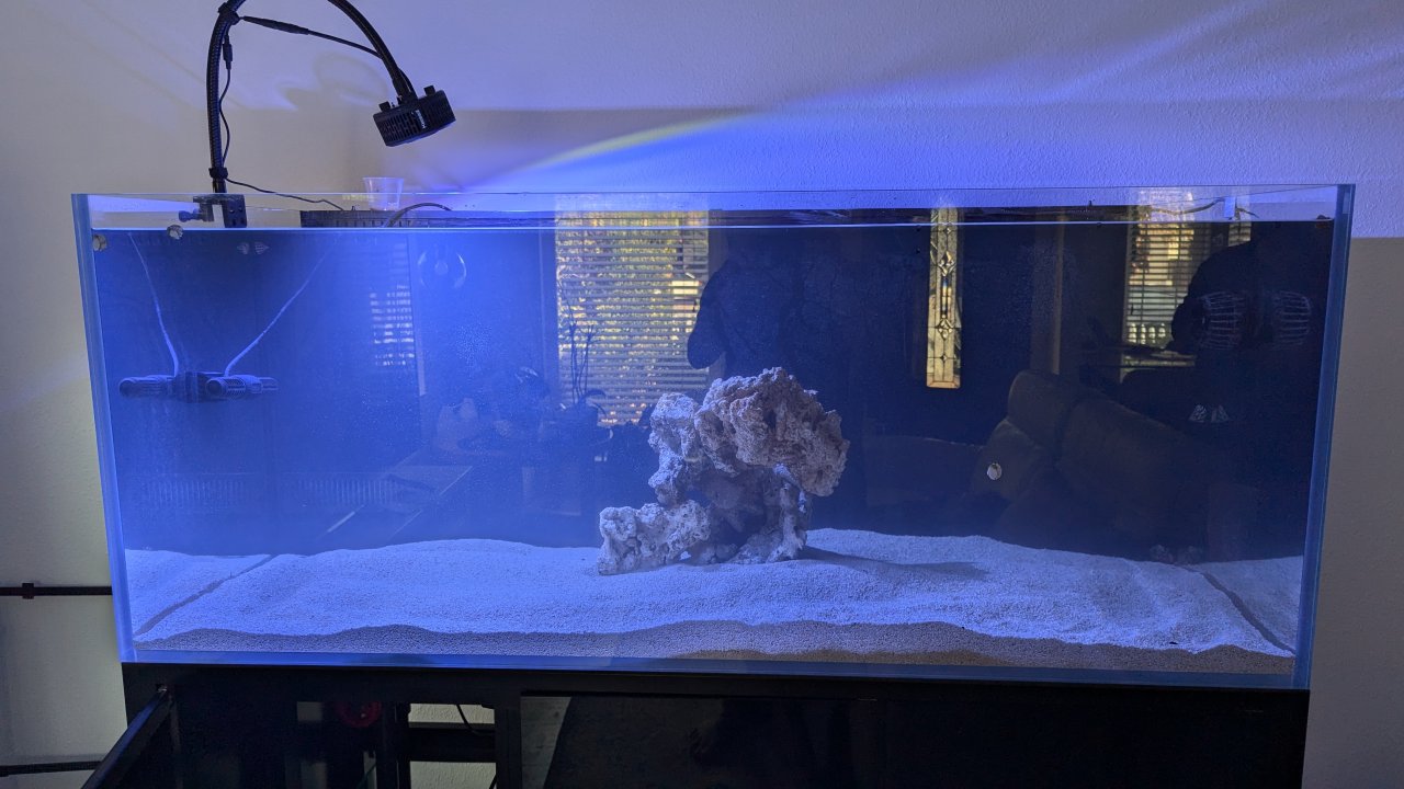 Progress is slow due to my injury, but thanks again to @derek_SR and Kessil for helping me with the A360XE light mount. Finally get to use the raffle winning light! It's up here temporarily while I figure out hardware, rocks, etc. I've been ghost feeding and added one trochus snail from my main system plus some hitchhiking brittle stars and an asterina from the swap.