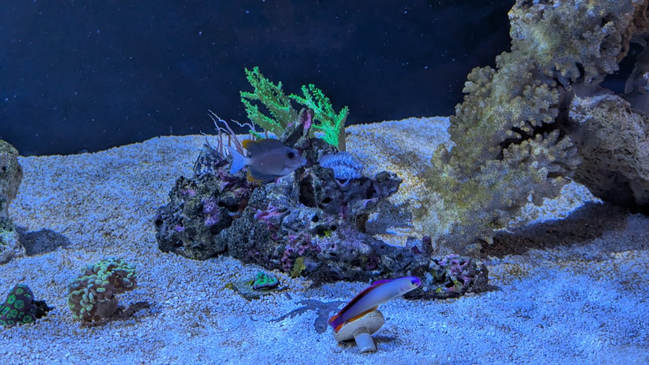 Added a Kessil WiFi dongle which is pretty nice to customize color and timing. Starting to see coralline algae forming on the new rocks (7 weeks since lights went on). Tiny bit of hair algae on the sand on the left, but the rocks are clean due to lots of snails, crabs, and a couple tuxedos. No true "ugly" phase by using cured rock methods, a tiny bit of established rock, and herbivores.