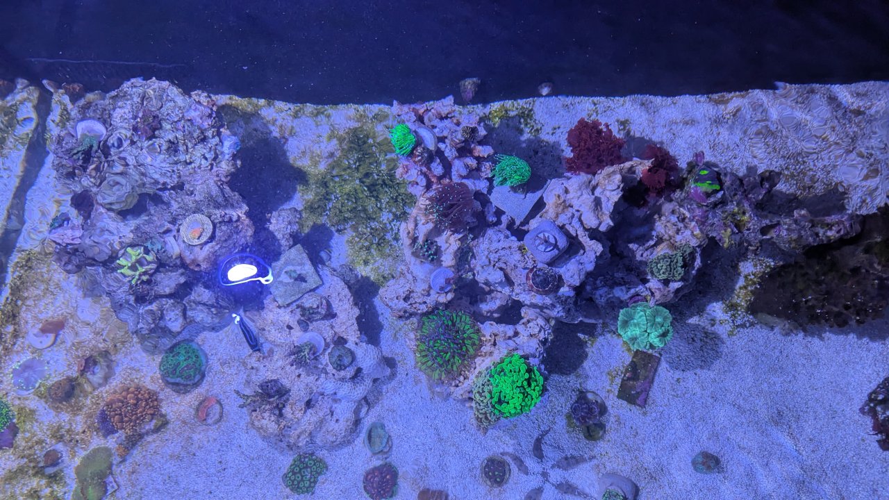 Did a 20% water change and cleaned things. Mounted the frags from @salty_taste and his dad. Nub of Oregon tort in the back right, some reddish polyped valida I think, @derek_SR 's Turaki in the front. Middle right booger is a WWC grafted monti. Left side some purple tipped green base acro: