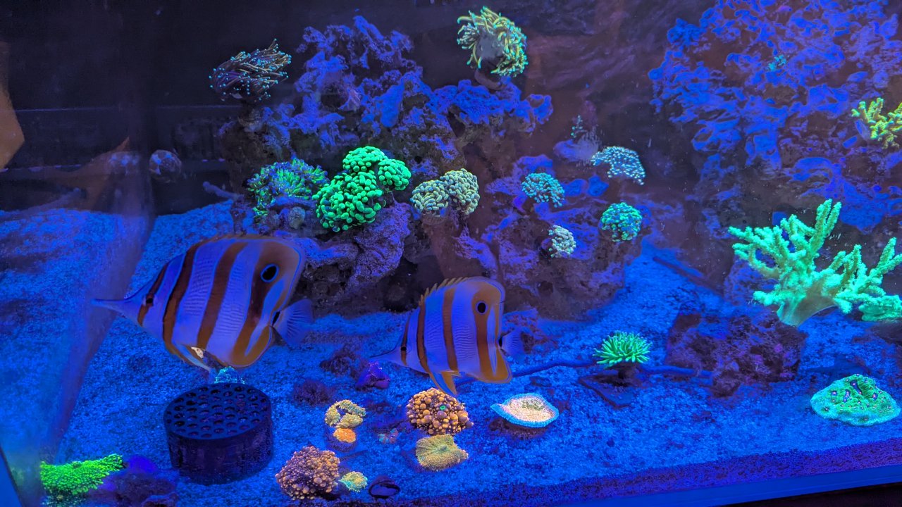 The clam fuge is very intresting. How has it been working out for you?Bunch of updates since it's been awhile. The female copperband had grown a ton the past few months and got larger than the male who was probably 15% bigger when I introduced him. All of a sudden she started getting aggressive when the lights turned off and was attacking the male to the point where he was trying to jump out of the tank.