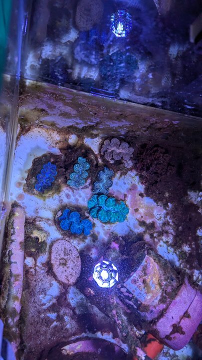 Babysitting tons of corals from @Ayman . Also one of the anthias stopped eating a month ago yet still is alive somehow hiding in a cave. Hoped that getting rid of the wrasse would help but it hasn't.