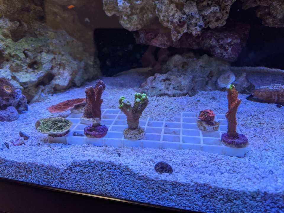 Moved all the frags except the duncan into the rock work. Everything was looking good -- the birdnest even started to show some new growth already.